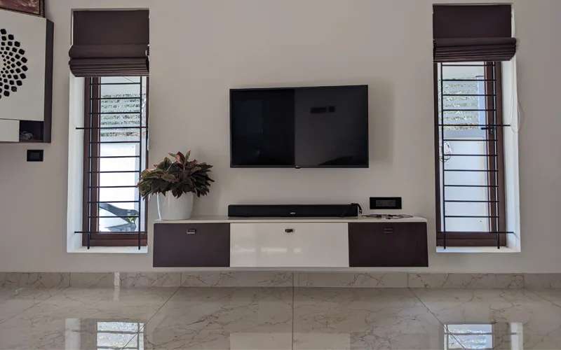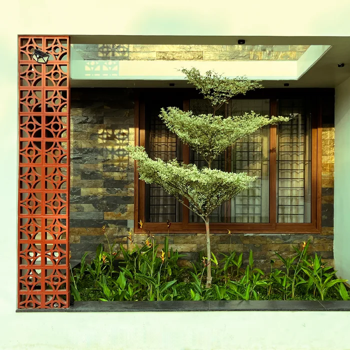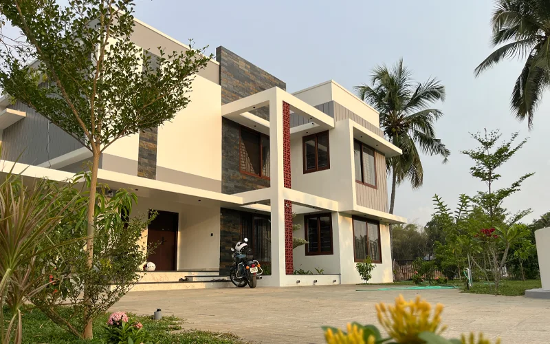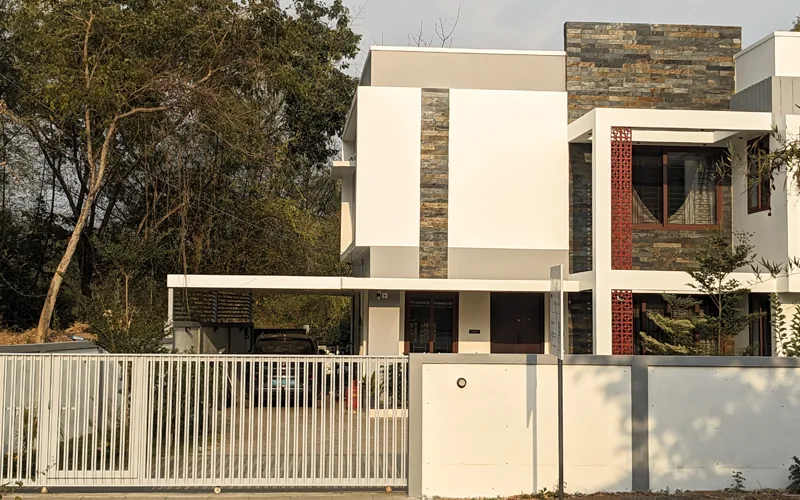 Deepak Residence epitomizes the essence of modern living amidst natural serenity. Nestled beside a tranquil pond, this two-story villa stands as a beacon of contemporary minimalist design. Its sleek architecture is adorned with captivating cladding works, drawing admiration from all who behold it. Surrounded by a lush canopy of trees, the residence emanates an aura of peace and tranquillity, offering a respite from the chaos of urban life. Here, amidst