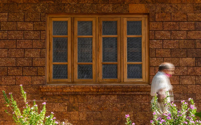 • Exterior : Warm brown claddings replace plain pink, embodying Tharavadu style.